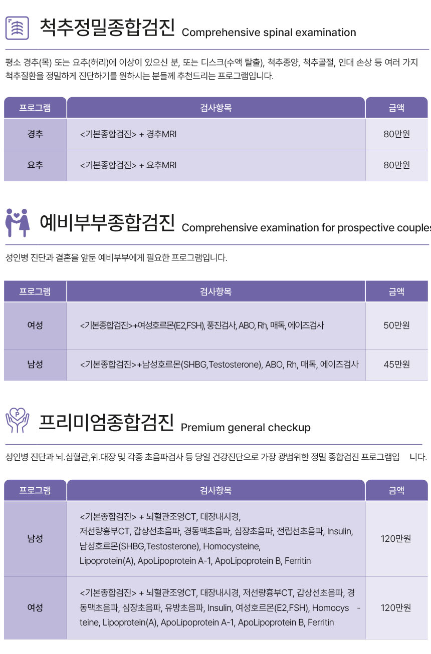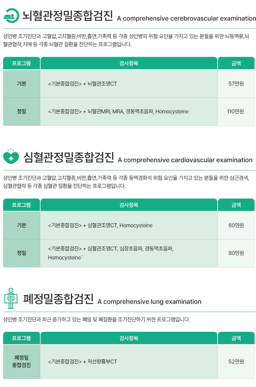 성인에게 발병가능한 성인병 예방 및 조기진단과 더불어 주요 초음파와 내시경, 암검사 등 보다 정밀하게 시행되어지는 검사입니다.