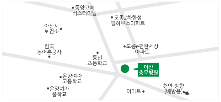 · 버스 이용시 : 1번 출구로 이동 → 온양온천역 버스정류장까지 약 160m 도보로 이동 → 간선버스 402번, 403,번, 404번 이용 → 대림아파트 정류장 하차 → 지하도 건너 병원까지 도보 120m 이동