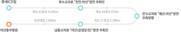 남풍세IC 출구에서 '아산' 방면으로 나와 → 복수교차로 '천안·아산' 방면 우회전 → 온수교차로에서 '아산'방면으로 우회전 → 남동교차로에서 '온양온천' 방면으로 오른쪽 방향 → 동신사거리에서 우측방향 60m