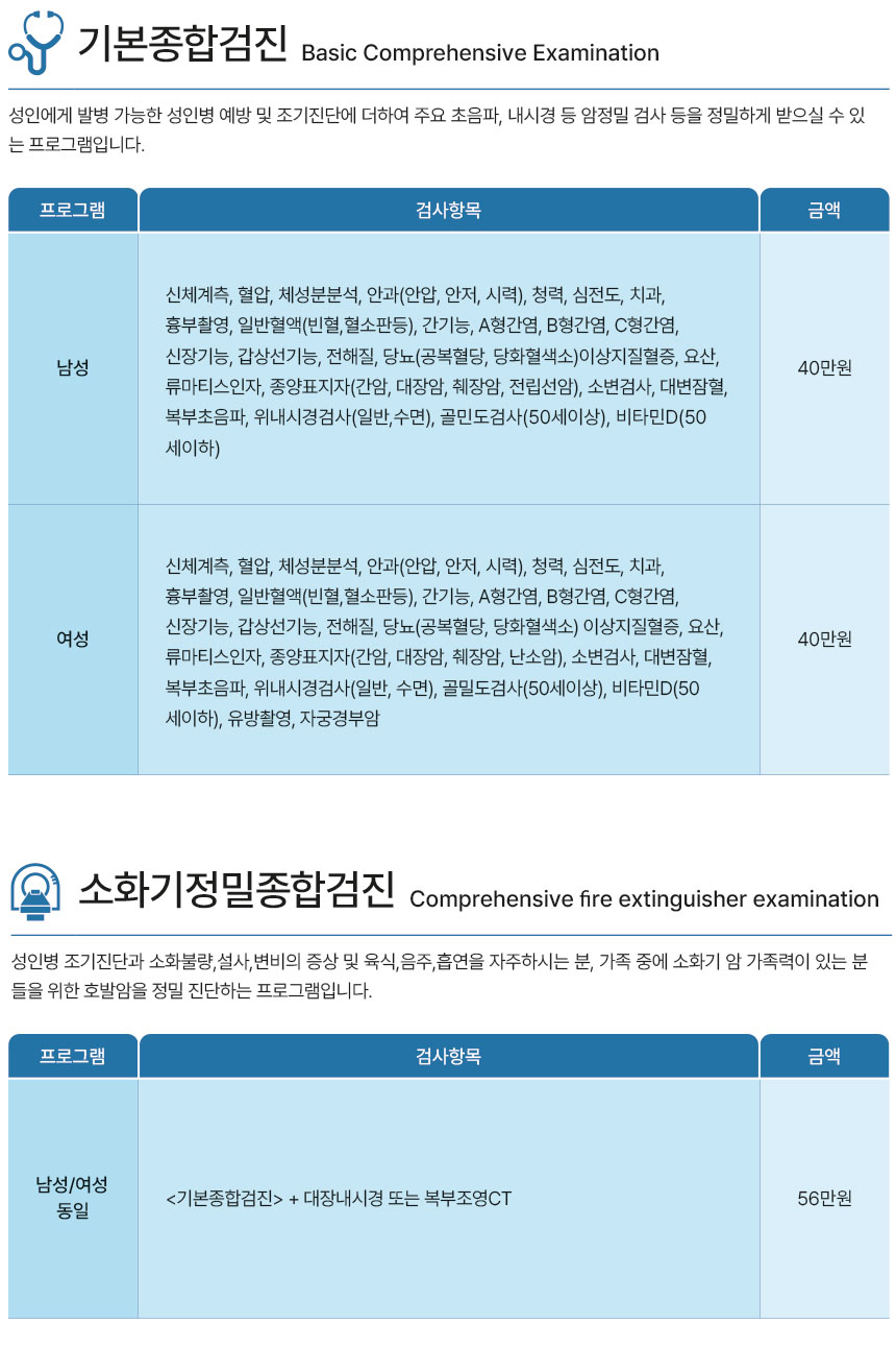성인에게 발병가능한 성인병 예방 및 조기진단과 더불어 주요 초음파와 내시경, 암검사 등 보다 정밀하게 시행되어지는 검사입니다.