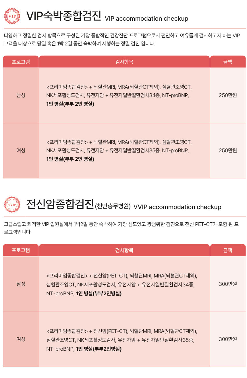 현대인에게 자주 발생하는 뇌ㆍ심혈관계 질환을 비롯하여 각종 암 질환들을 최첨단 장비를 통해 정밀하게 검사하는 프로그램으로 1박 2일 동안 VIP병실에 머물면서 편안히 검사를 받으실 수 있는 프로그램입니다.
