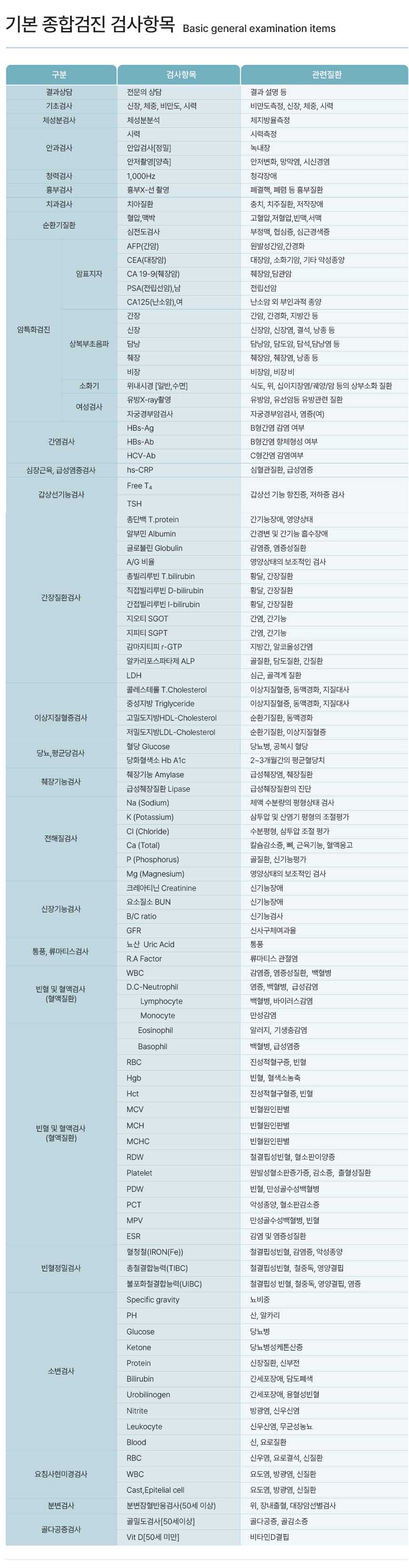 성별, 연령대별로 가장 중요한 질환들에 대한 필수적인 항목우로 구성된 검사 프로그램입니다. 건강 검진을 받고자 하는 분들은 최소한 기본 검진에 포함된 항목들은 빠짐없이 받기를 권유합니다.