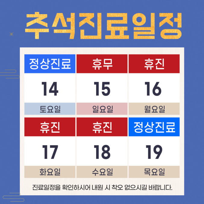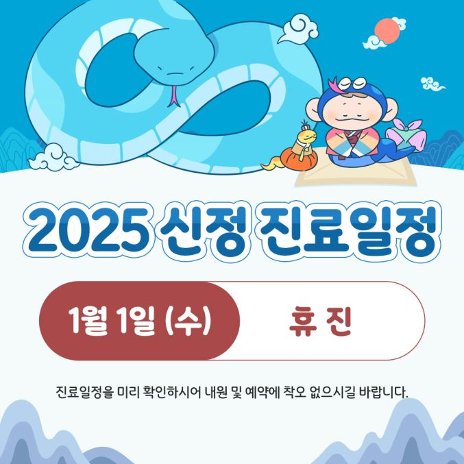 설연휴(1/28~1/30)에는 휴진, 임시공휴일(27일)은 정상진료합니다.